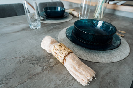 Rustic table setting with blue ceramic bowl on stone background with copy space