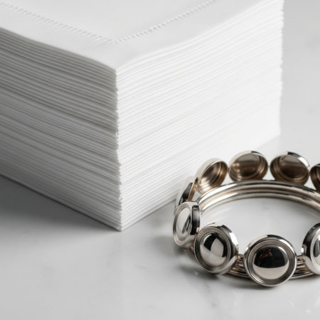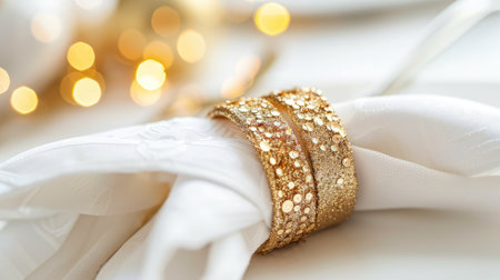Elegant gold napkin rings on white cloth with bokeh lights in background