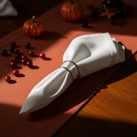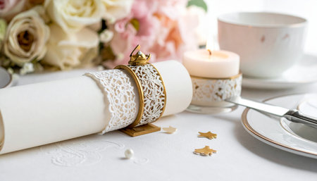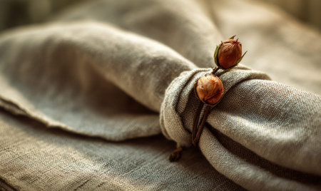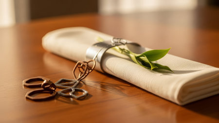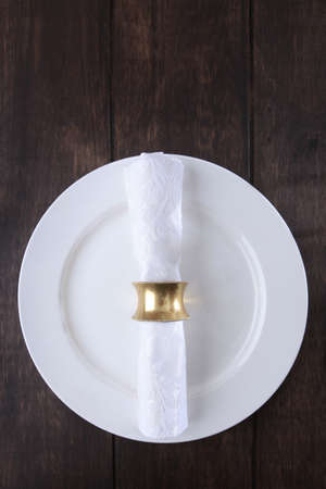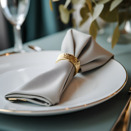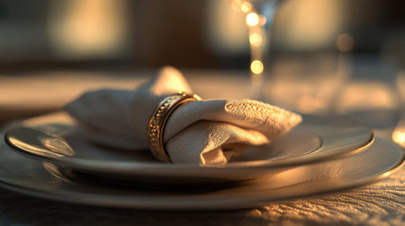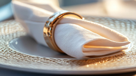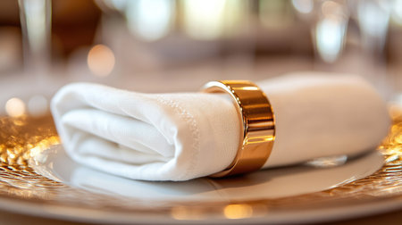 A stunning closeup captures an elegant table setting featuring a white napkin rolled neatly and secured with a gold ring, showcasing luxury.