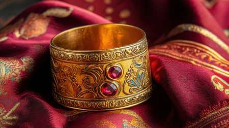 This exquisite antique gold bracelet features intricate designs and luminous red gemstones, elegantly placed on luxurious red silk fabric. Perfect for showcasing fine craftsmanship.