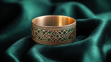 This stunning gold and green bracelet features geometric patterns that exude elegance and craftsmanship. The soft fabric backdrop adds to the luxurious presentation.