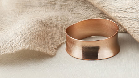 This stunning copper ring sits elegantly on a soft, beige fabric backdrop, highlighting its sleek design and texture, perfect for fashion and jewelry themes.