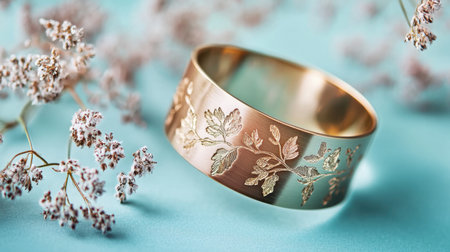 This striking bracelet blends gold and rose gold with delicate floral etchings, showcasing contemporary elegance against a calming blue backdrop.