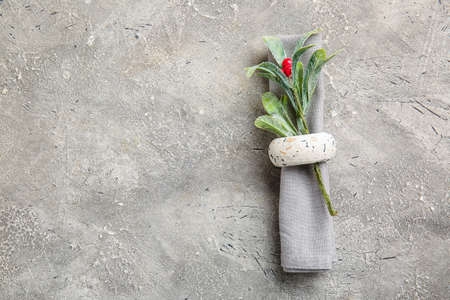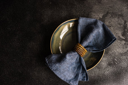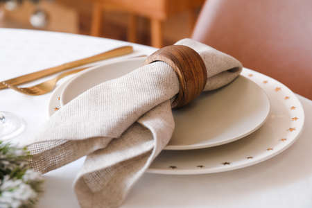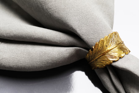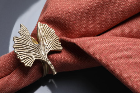 Fabric napkin and decorative ring for table setting on gray plate, closeup