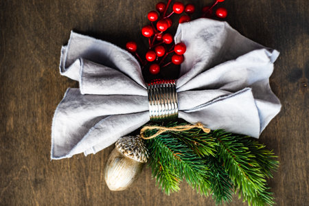 Festive table setting with napkin in ring decorated with red berries and christmas tree branches on wooden table