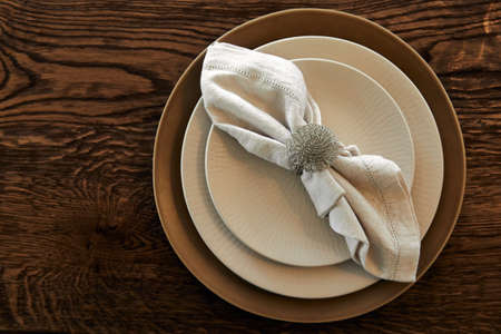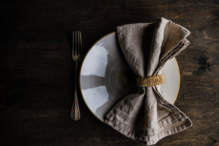 Rustic table setting with ceramic plates, napkin and silverware on dark wooden table