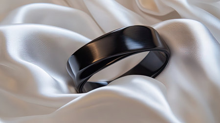 A beautifully crafted black ring placed elegantly on soft satin fabric, creating a luxurious and modern aesthetic perfect for jewelry lovers and fashion enthusiasts.