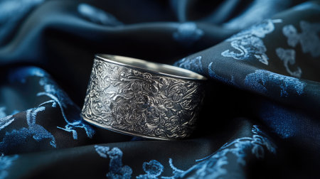 This stunning image features an elegant silver ring with intricate floral engravings displayed on rich blue fabric. The contrasting textures highlight craftsmanship and beauty.