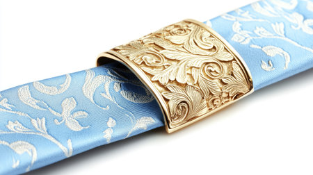 This image showcases an elegant blue satin ribbon embellished with an ornate gold clasp featuring a delicate floral design, perfect for fashion displays.