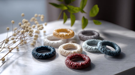 A vibrant assortment of colorful textured rings arranged beautifully on a soft surface, complemented by delicate flowers and green leaves, capturing elegance.