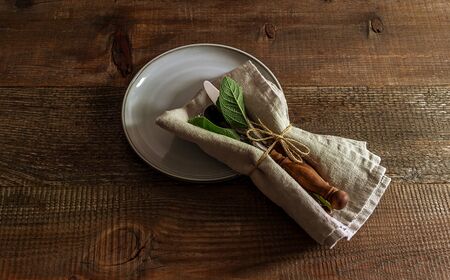 Rustic set of cutlery knife, spoon, fork with linen napkin on the plate. Old wooden table.