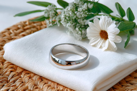 Silver wedding ring lying on white napkin with flowers on wicker placemat, representing commitment and love
