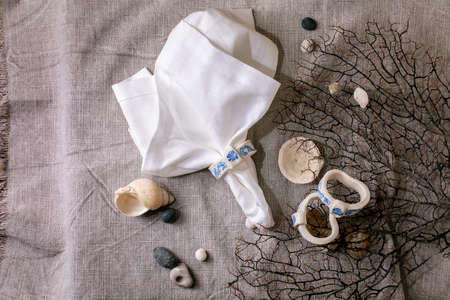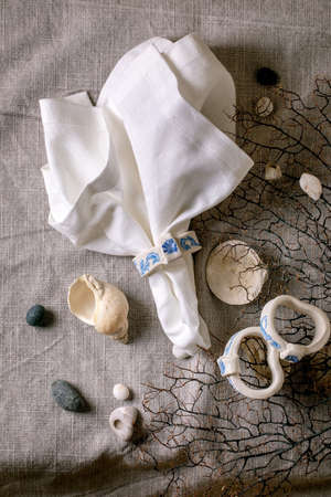 Marine table setting elements. White linen napkin with handcrafted porcelain napkin ring, hand painted with marine ornate, on grey tablecloth with sea shells around. Flat lay.