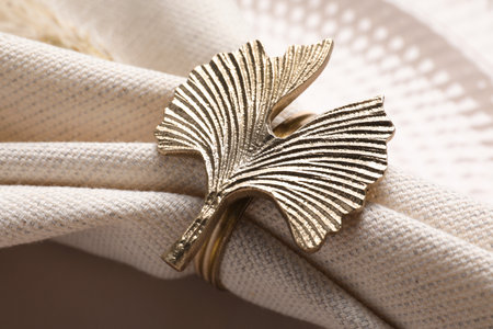 Fabric napkin and decorative ring on plate, closeup