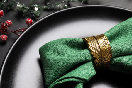 Plate with green fabric napkin and decorative ring on black background, closeup