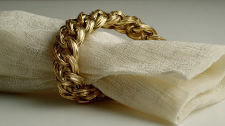 A stunning gold napkin ring intricately woven sits elegantly on a soft linen cloth, perfect for adding a touch of luxury to any dining table setting.