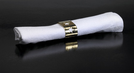 Studio photography of a white serviette and golden serviette ring in dark reflective back