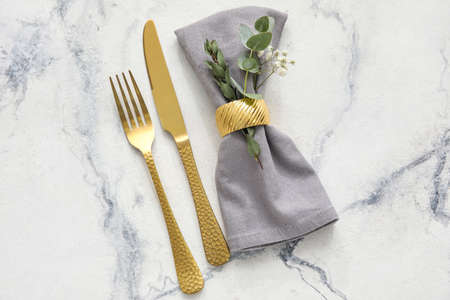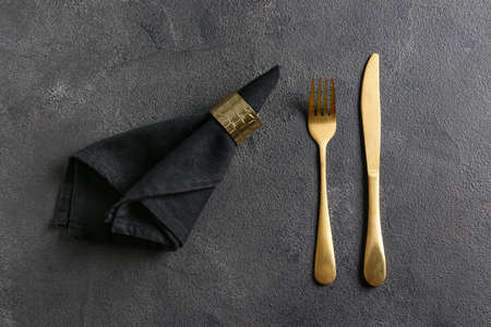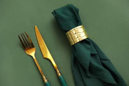 Elegant table setting with golden cutlery and napkin, closeup