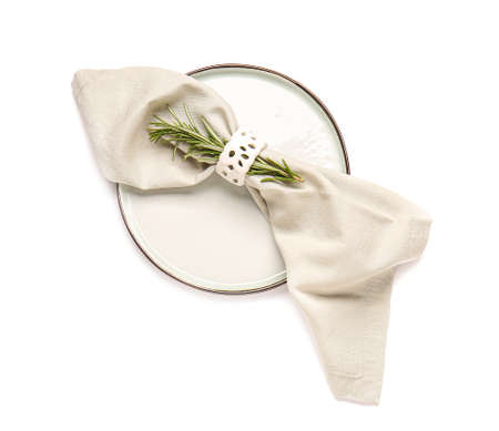 Clean napkin and plate on white background