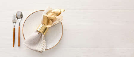 Simple elegant table setting on white wooden background with space for text