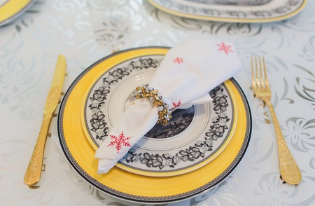 Empty plate with a napkin. Luxury wedding reception in restaurant. stylish decor and adorning. Stylish Napkin
