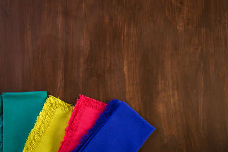 Heap of linen cotton napkins fabric on wood table background. Different colors brown, gray and striped. Food photo props.