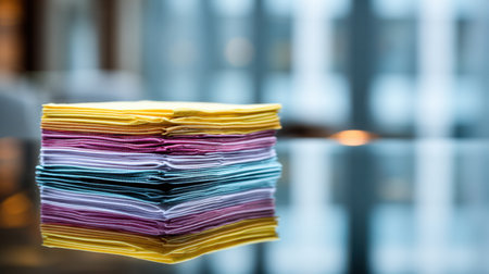A vibrant arrangement of stacked napkins in yellow, pink, and blue creates an elegant setting. The reflective surface enhances the colors, ideal for event decor or restaurant ambiance.