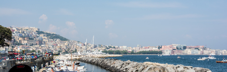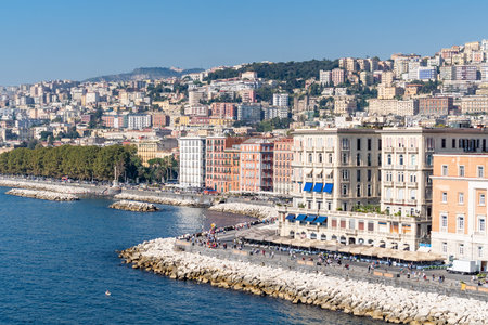 Naples, Italy, October 2019: Partenope Street in the Naples Bay. Seafront view from the egg castle, Castel dell'ovo, Naples, Italy. High quality photo