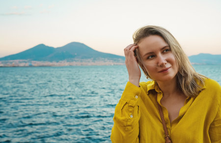 Pretty woman on the background of Vesuvius volcano in Italy.