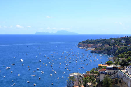 Panorama of high cliffs, Tyrrhenian sea bay with pure azure water, floating boats and ships, pebble beaches, rocky surroundings of Meta, Sant'Agnello and Sorrento cities near Naples region in Italy