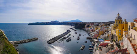 Panoramic view of the beautiful Procida in sunny summer day. Marina Corricella, clear blue sky and blue sea.