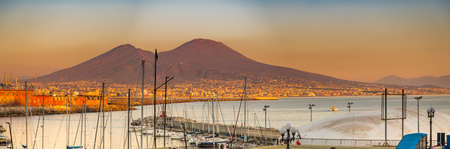 Aerial scenic view of Naples with Vesuvius volcano at sunrise. Campania, Southern Italy