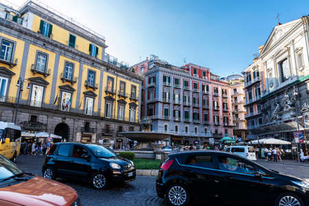 Naples, Italy - September 9, 2019: Fontana del Carciofo (Artichoke Fountain) in piazza Trieste e Trento with people around and traffic in Naples, Italy