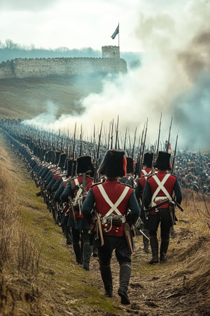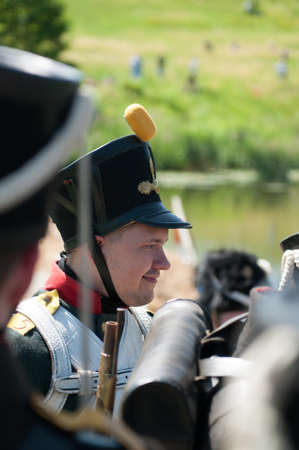 MOSCOW REGION, RUSSIA - SEPTEMBER 05: Reenactment of the Borodino battle between Russian and French armies in 1812. soldiers of Napoleon's army. Borodino, Russia, September 05, 2011