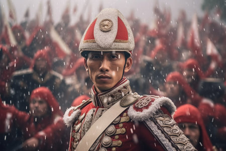 A soldier dressed in a traditional military uniform stands with a musket, exuding a sense of pride and duty. The colorful background enhances the historical portrayal.
