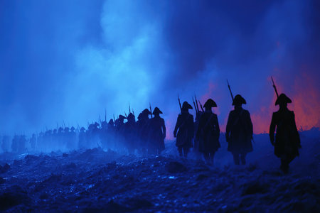 Soldiers in historic uniforms march determinedly through a foggy landscape illuminated by vivid blue and orange lights. The atmosphere captures the intensity and chaos of a nighttime battle.