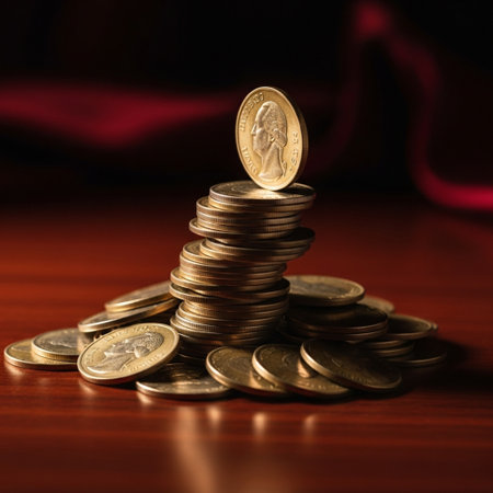 Coins featuring a historical figure lie among various metallic currency on a reflective surface in a captivating arrangement