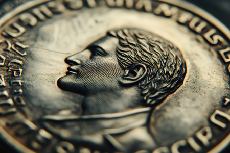 A beautifully engraved coin reveals a regal figure, showcasing intricate designs and textures. Soft light illuminates the metallic surface, highlighting artistry and historical significance.