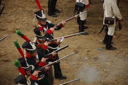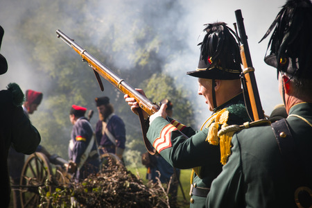 SREBRNA GORA, POLAND - JUNE 11: 1807 Napoleon's forces battle reconstruction, siege of the Srebrna Gora fortress. French musketeer shot on June 11, 2011.