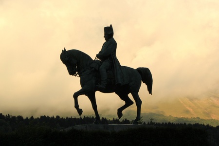 Sculpture of Napoleon on his horse by cloudy sunset, Laffry, France. It was realized by Fremiet artist.