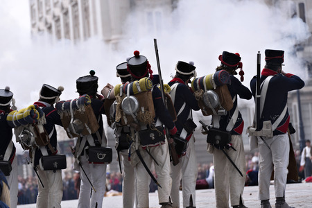The reenactors dressed as Napoleon epoch soldiers for celebration the Napoleon birthday who was born in Ajaccio 250 years ago.