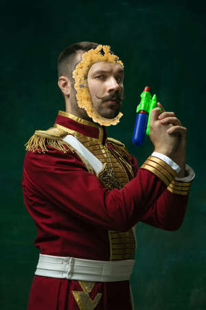 Young man in suit as royal person isolated on dark green background. Retro style, comparison of eras concept. Beautiful male model like historical character, monarch, old-fashioned.
