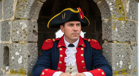 Malaga, Spain - October 26, 2014: Portrait of a captain of the 1800s Royal Navy. Reenactor wearing a british uniform, blue frock coat and bicorn hat. People behind with the royal marines uniform.