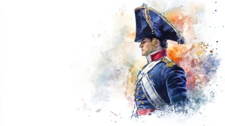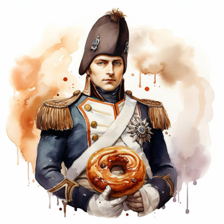 a captivating watercolor illustration of napoleon bonaparte, adorned with a rich chocolate glaze, viewed from a bird's-eye perspective against a pristine white backdrop. ai generated