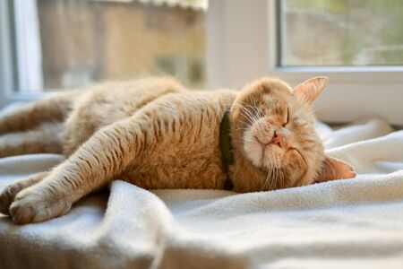 Beautiful red cat lies on the windowsill on a sunny day. Cute red cat lies on a white bedspread. Close-up. The pet is resting at home. A place for text.