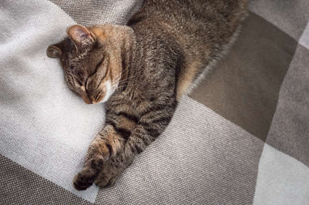 Cute tabby cat sleeping on a sofa in the living room