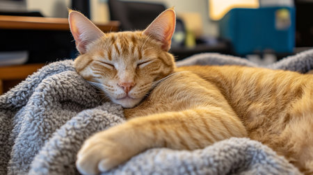A cat with orange fur rests comfortably on soft blankets in a relaxed indoor setting, enjoying a serene moment.