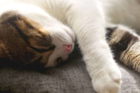 Beautiful domestic cat is sleeping on a windowstool outside, close-up portrait
