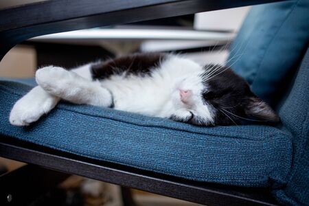 cute little cat sleeping in blue armchair