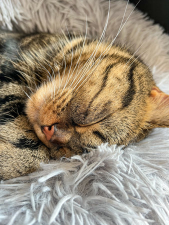 Cute tabby Scottish Straight marble tabby cat sleeping on a fur pillow, close up